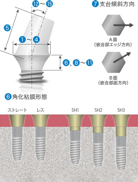 | マージンライン半径(mm) | 支台高さ(mm) | 角化粘膜形態 | 支台傾斜方向(舌側面) | |||